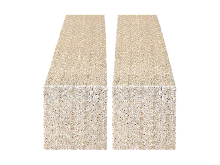 - (1) 2 Pieces Mesh Sequin Table Runner Champagne Gold 12 x 80 inch Glitter Table Runner Roll for Wedding Birthday Party Bridal Shower Christmas Decorations
