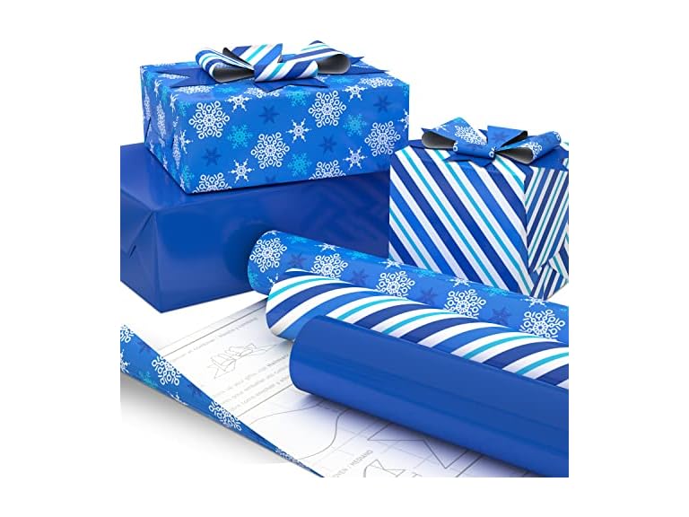 - THREE FESTIVE DESIGNS: Bundle of winter gift wrap features 3 versatile designs: Snowflakes in shades of blue and white, diagonal stripes in blue and white, solid royal blue