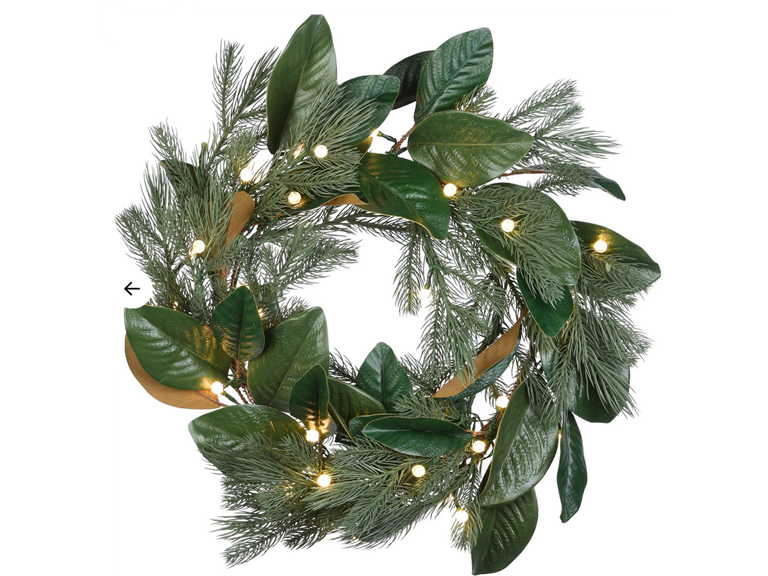 This holiday wreath features a mixture of wide magnolia leaves and soft pine branches swirling around a sturdy wire ring base. It is pre-lit with 35 battery operated warm white “berry" LED lights that are energy efficient and long lasting. Included is an option for 6 hours ON/18 hours OFF timed operation. Also included is a convenient handheld remote to control the lights. This wreath can be displayed on doors, walls, and windows in indoor or covered outdoor locations.