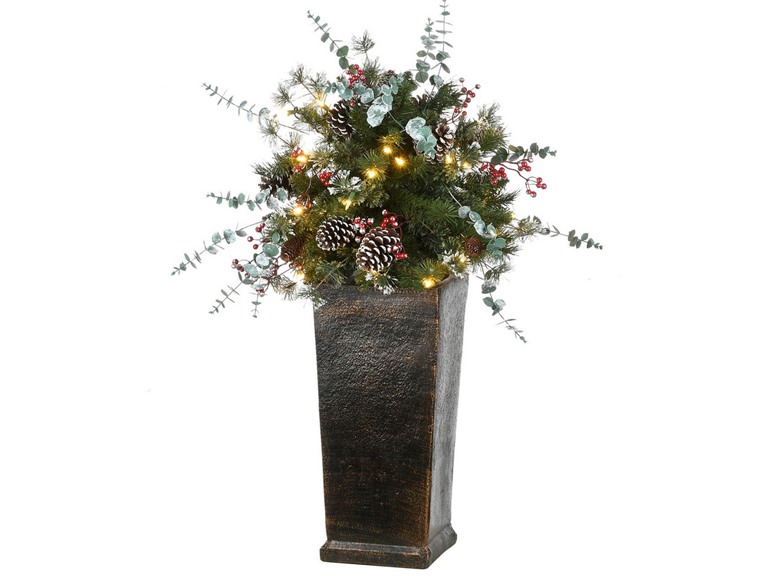 This attractive and unique evergreen decoration is perfect for displaying in doorways, hallways, porches, and patios. It is pre-lit with 50 warm white LED lights and trimmed with red berries, pinecones, and leafy silver stalks. A tall, elegant, and sturdy