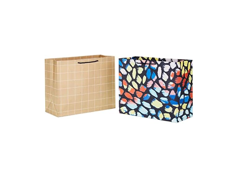 - (1) Hallmark 10" Large Horizontal Gift Bag Bundle (2 Bags: Colorful Brushstrokes, Kraft Brown Grid) for Birthdays, Easter, Mother's Day, Graduations