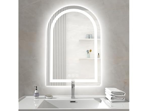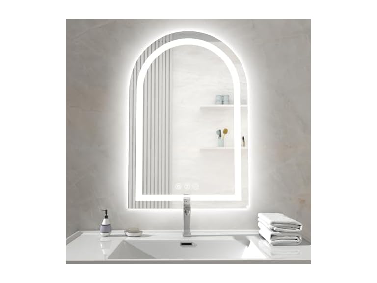 - 【Smart Anti-Fog Technology】This arched bathroom mirror with lights maintains crystal clarity in steamy conditions. Its instant-activated defogger automatically shuts off after 1 hour to prevent energy waste, ensuring hassle-free use during showers