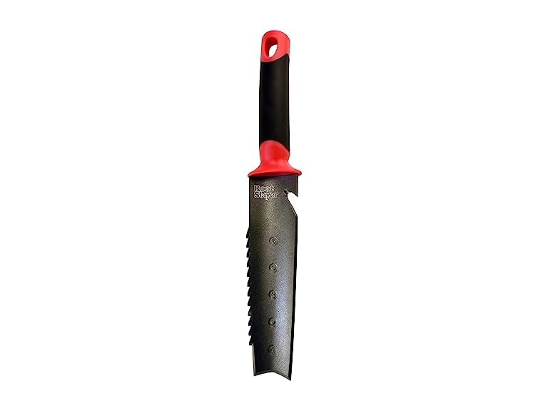 We might have called the Root Slayer Soil Knife the Root Slayer Hori , but we were afraid people might not know about one of the oldest and most essential garden tool designs of all time. Based on original Japanese designs, but updated with modern materials and style, the Root Slayer Soil Knife can perform the functions of almost any hand tool in the garden. Use it as a substitute for a trowel, transplanted, cultivator, or most importantly, a weedier. This handy digger will cut through root-filled, heavy clay soil with surprising ease. When in the lawn, garden, or potting shed we never like to be without this versatile garden tool. Delivered with an enamel powder coating, the Root Slayer Soil Knife features an array of a dozen saw-like cutting teeth on one side, a long sharp blade on the other side, the signature Root Slayer inverted V blade tip, and a combination twine cutter and bottle opener near the ergonomic grip. Feel free to sharpen any or all of the high-carbon steel cutting surfaces for a very long lasting edge.