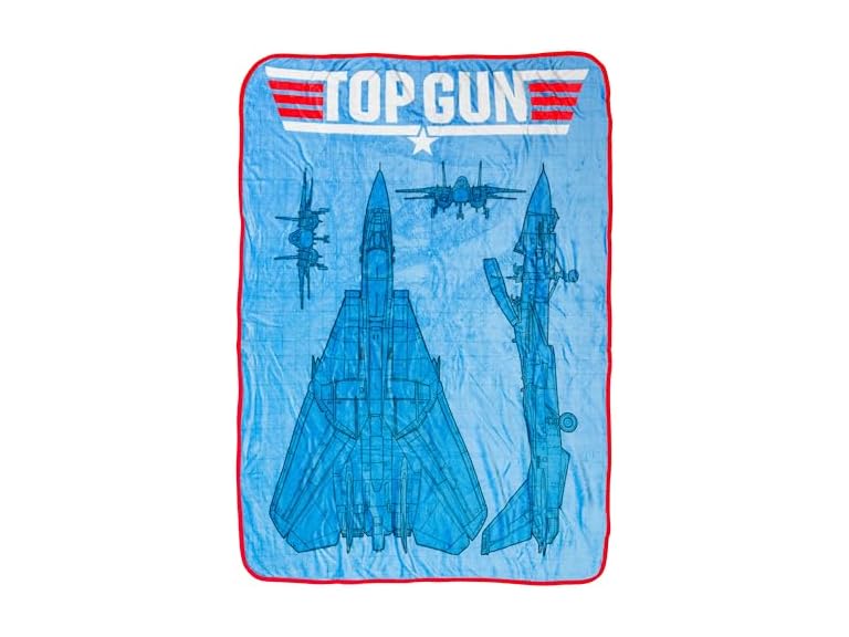 - TOP GUN: Throw blanket features a schematic of Maverick’s plane. The Top Gun logo is featured at the top of the blanket. Throw is blue and is complete with a red border.