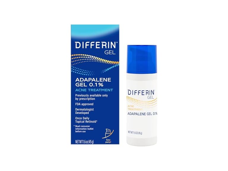 (1) Differin Acne Treatment Gel, 90 Day Supply, Retinoid Treatment for Face with 0.1% Adapalene, Gentle Skin Care for Acne Prone Sensitive Skin, 45g Pump (Packaging May Vary)