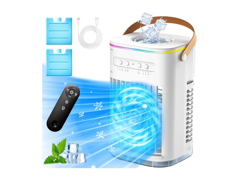 - (1) 4-IN-1 Personal Air Conditioner w/Remote, 2 Ice Packs, 1200ML Tank, 7H Timer for Smart Auto-Off,2 Cool Mist,3-Speed Small Portable Air Conditioner, 7-LED Light Evaporative Air Cooler for Room