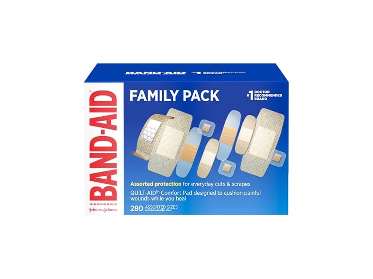 In the Box: (1) and-Aid Brand Adhesive Bandages Family Variety Pack, Sheer & Clear Flexible Sterile Individually Wrapped Bandages for First Aid Wound Care for Minor Cuts & Scrapes, Assorted Sizes, 280 ct
