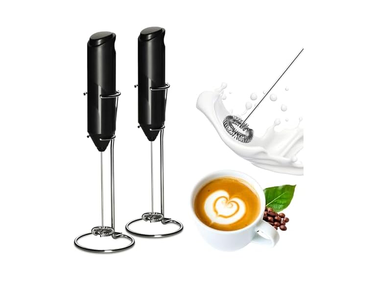 - (1) YSSOA Electric Milk Frother Handheld with Stainless Steel Stand Battery Operated Whisk Drink Mixer for Coffee, Frappe, Matcha, Latte, Hot Chocolate, Mini Hand Blender, Black 2 Pack