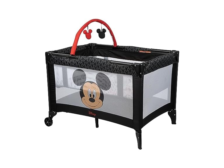Your child will have fun playing at home or anywhere you travel with the Disney Ultra 3D Play Yard that’s easy to set up in just minutes. Stylish and cute in pink and black, this mini nursery is both a cozy bassinet and full-size play yard that gives baby plenty of space to nap or play. The bassinet comforts your resting child and has an open-view, breathable mesh with an adorable Mickey graphic. After naptime is over the play yard features delightful Disney toys that swing on a detachable toy bar to amuse your little one. You can also easily move the play yard from room to room with two built-in wheels for mobility. When you’re out and about, the compact fold and carry bag make it easy to toss in the trunk and take along for the ride. This product is designed with a firm, flat sleeping surface that meets the Consumer Product Safety Commission’s recommendations for safe sleep.
