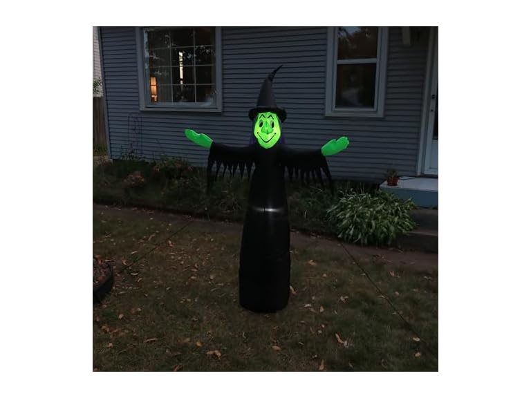 - Ready to set up right away: This outdoor Halloween inflatable comes with a built-in 12V blower fan to automatically inflate the decoration, 4 stakes and 2 ropes to keep it securely on the ground, 1 UL adapter with a 73" L cord for powering the blower, and 2 built-in LED lights (1.4 watts, 108 lumens, 8,000K) for illumination. This witch self inflates in approximately 1 minute.