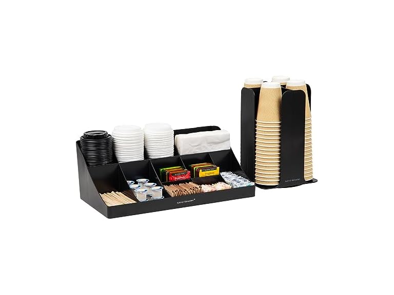 - Ample storage: Fill this set up with everything you need to enjoy coffee or tea - cups, lids, single serve pods, tea bags, stirrers, creamers, sweeteners, napkins and more
