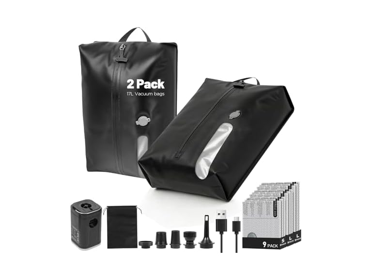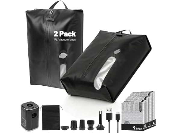 - All-in-One Travel & Home Vacuum Storage Kit:Set includes 2 TPU vacuum luggage bags, 9 PA+PE vacuum bags, electric pump, 5 universal nozzles and storage pouch. Supports pump suction or manual compression. Ideal for carry-on travel, gym gear, dorm rooms, home organization and seasonal storage.