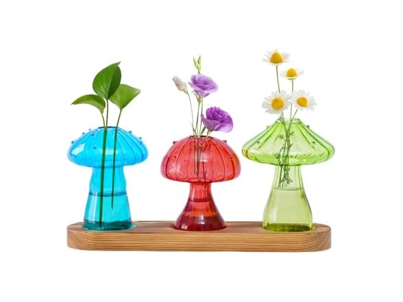 - A Great Gift:Brings bursts of colorful art into your home.Set of 3 mushroom propagation vases with wooden tray comes in his own beautifully designed box,ready to bring happiness to anyone.The perfect gift for everyone who loves life - your mom, grandma, wife, sister will adore it. Ideal for Mother's Day, birthdays, Christmas, Valentine's Day, and Thanksgiving. A thoughtful present for nature lovers and gardeners. Also makes a beautiful wedding party, anniversary, or special occasion decor gifts