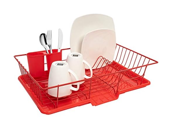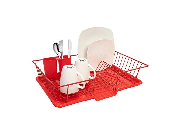 - Sweet Home Collection 3 Piece Metal Dish Drainer Rack Set with Drying Board and Utensil Holder, 12" x 19" x 5", Red
