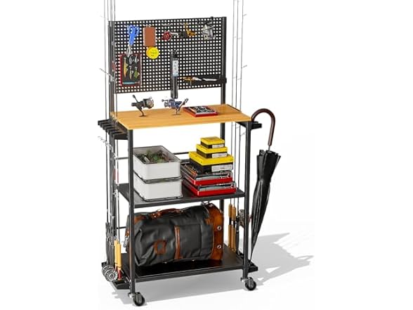 - 1. Big Storage, Zero Clutter Stop juggling rods, reels, and tackle boxes like a circus act. With 3 large tiers and room for up to 12 rods, you’ll finally have space to breathe. Perfect for taming your chaotic garage or prepping for a weekend fishing trip. Three roomy shelves, six hooks, and a rod holder system keep everything in check.