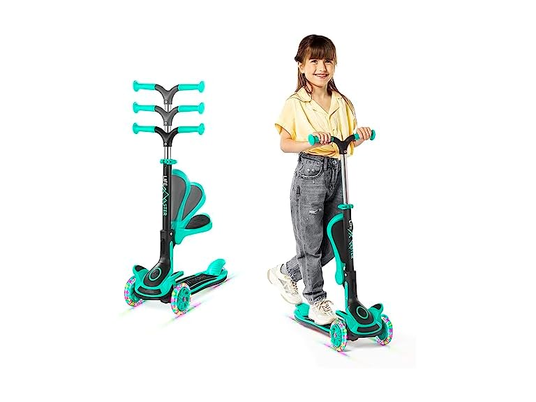 - (1) 3 Wheel Scooter for Kids with Foldable Seat, Adjustable Handlebar Height, Lean-to-Steer Ride On Toy for Kids Ages 2+, Light-Up LED Wheels, Wide Anti Slip Deck, Indoor & Outdoor Use, Teal