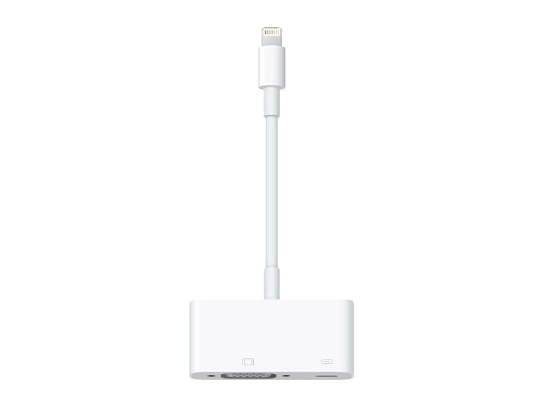Use the Lightning to VGA Adapter to mirror whatever's on your iPhone, iPad, or iPod touch with Lightning connector apps, presentations, websites, and more on your VGA-equipped TV, display, projector, or other compatible display in up to 720p HD. Video mirroring is supported on all compatible devices. Watch video on the big screen in up to 1080p by connecting your device with a Lightning connector to a television, projector, or other VGA-compatible display. Video out supports up to 1080p for iPad mini, iPad with Retina display, iPhone 5, and iPod touch (5th generation). The Lightning to VGA Adapter connects to your iPad with Retina display, iPad mini, iPhone 5, or iPod touch (5th generation) via the Lightning connector and to your projector or display using the VGA adapter. Compatible with: iPhone 5 iPod touch 5th generation iPad 4th generation iPad mini