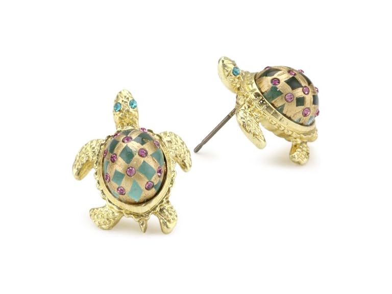 - Charming turtle stud earrings embellished with green shell, delicate pink stone accents and textured details. Earrings are set in gold-tone metal with a post back closure.