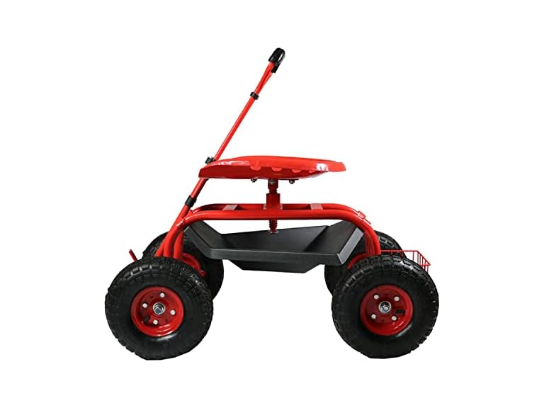 This rolling garden cart features a large, steel seat and an extendable handle that makes this garden cart a dream to use while working in the yard. Aside from the convenience, this cart is engineered to last with a heavy-duty, powder-coated steel frame, steel axles, an extendable steel handle, a matching steel wire basket, pneumatic tires with coated rims, and a black plastic tray for holding tools and other convenient items. The seat features a 360-degree swivel motion to face any direction needed to complete the job. Moving this cart is easy too, just pull the cart with the extendable steering handle. Use this handy swivel cart while working in the yard to alleviate back strain or to take a well-deserved seat whenever needed. And, finish landscaping jobs in half the time.