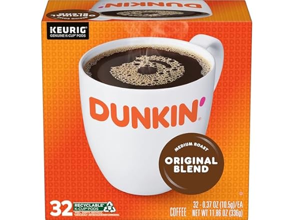 - CONTAINS: One 32-count box of Dunkin’ Original Blend Coffee K-Cup pods