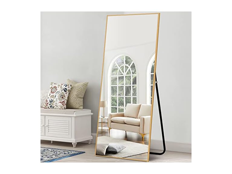 - (1) NeuType 71"x28" Full Length Mirror with Standing Holder Aluminum Alloy Frame Floor Mirror Wall-Mounted Mirror for Living Room, Bedroom, Hanging or Leaning Against Wall, Golden (with Stand)