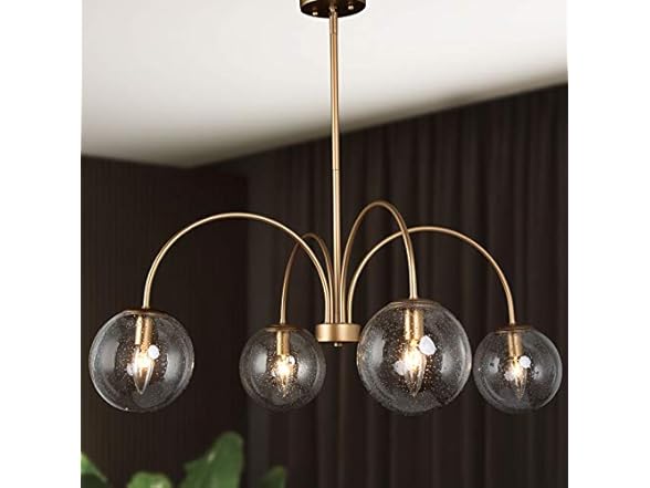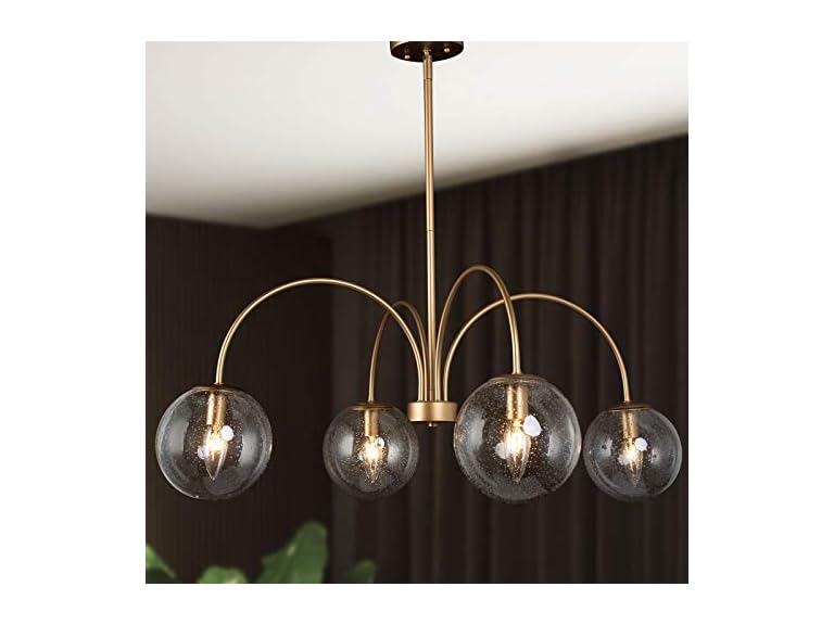 - [Large Modern Chandelier]: This dining room chandelier features 4 globe seeded glasses with elegant arms that is extending out from the center post, and each light bulb and glass shade is downward, which makes the light source diffuses outward from the center. With the elegant appearance and strong light transmission glass shades, this modern gold chandelier releases glaring and luxury light.