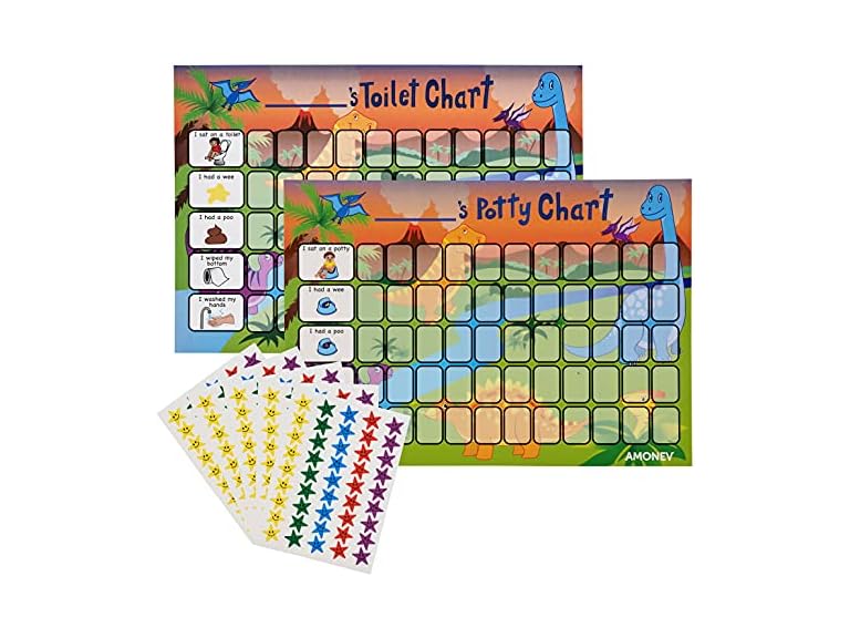- POTTY & TOILET TRAINING CHART: Amonev present our First Stage Potty Training and Second stage Dinosaur Toilet training reward charts. So that’s 1 x A4 Potty Training Chart, 1 x A4 Toilet Training Chart and with 225 Stars Included.