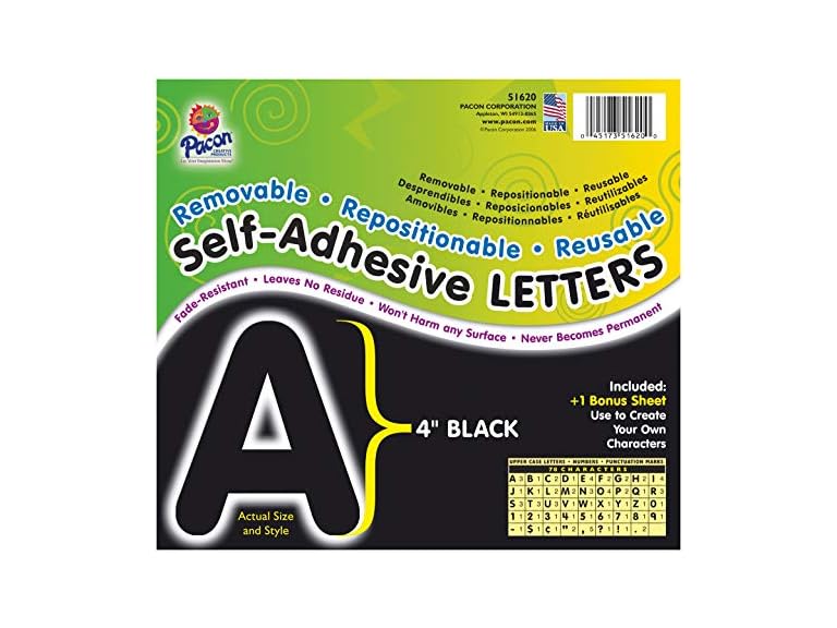 - Pacon® PAC51620 Self-Adhesive Letters - Removable, Repositionable, Reusable, 4", Black, 78 Pieces