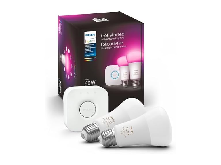 - WHAT’S IN THE BOX - Includes one Hue Bridge and two Hue white and color ambiance LED smart 60W A19 E26 base light bulbs suitable for most fixtures; Perfect for general lighting anywhere in your home