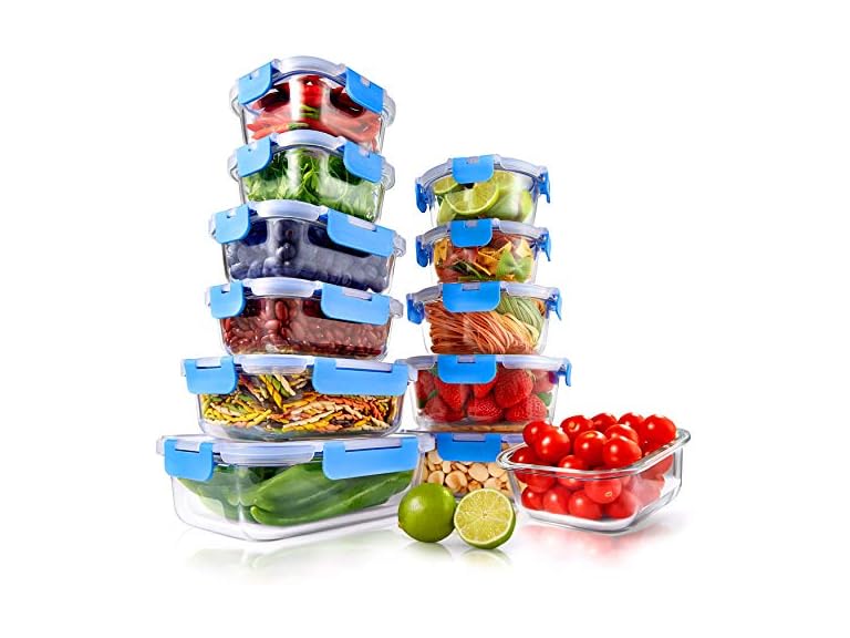 - (1) NutriChef 24pcs Glass Food Storage Containers, (12 Stackable Heavy Duty Meal Prep Containers w/ 12 Airtight Lids), Microwave, Freezer, & Dishwasher Safe for Food, Snacks, Fruit & More, (Blue)