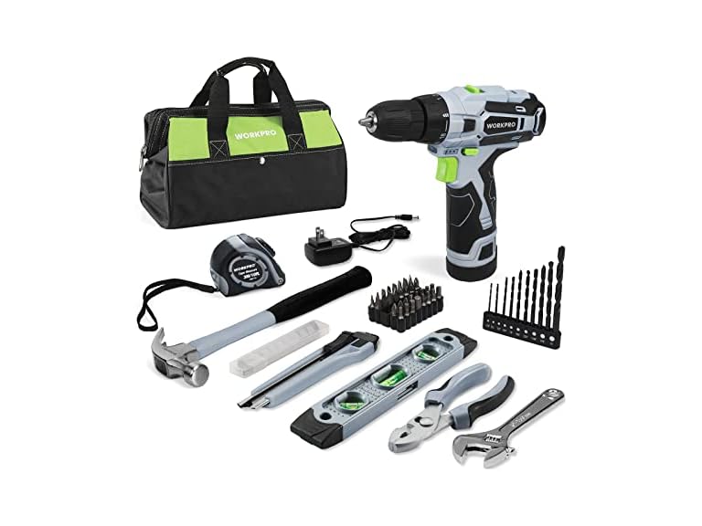 - High Quality & Affordable Drill Kit: 12 V Cordless Drill Driver with 1*1.5 Ah Lithium-ion Battery, 1*Charger, 1*Utility Knife, 10*Utility Knife Blades, 10*HSS4241 Drill Bits, 1*60 mm Bit Holder, 32*CR-V Screwdriver Bits,1*6 inch Slip Joint Pliers, 1*6 inch Adjustable Wrench, 1*8 oz Fiberglass Claw Hammer, 1*10 Ft (3 m) Tape Measure, 1*Torpedo Level, 1*14-inch Storage Bag