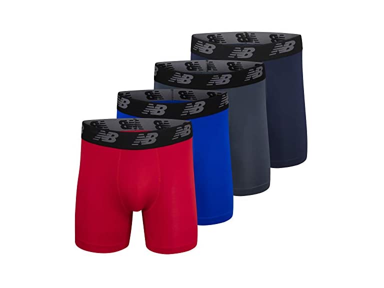 - What’s Included: 4 New Balance Men’s Performance 5” No Fly Boxer Briefs underwear. The sizes are available in Small (29-31” inches), Medium (32-34” inches), Large (36-38” inches), and X-Large (40-42” inches). The boxers come in a variety of colors, ranging in each 4-pack from: Grey/Gray, Black, Blue, Royal, and Pigment.