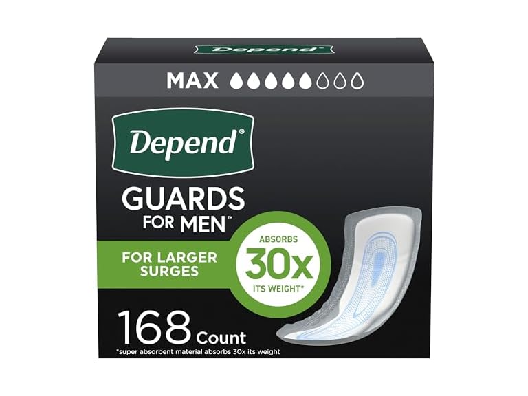 - (1) Depend Guards Incontinence Pads for Men, Maximum Absorbency, 168 Count (2 Packs of 84), Packaging May Vary