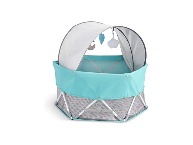 - INDOOR AND OUTDOOR: includes a UPF 50 plus canopy for sun protection; Light weight design with carry case for instant portability; Sets up and folds down in seconds; Compactly folds