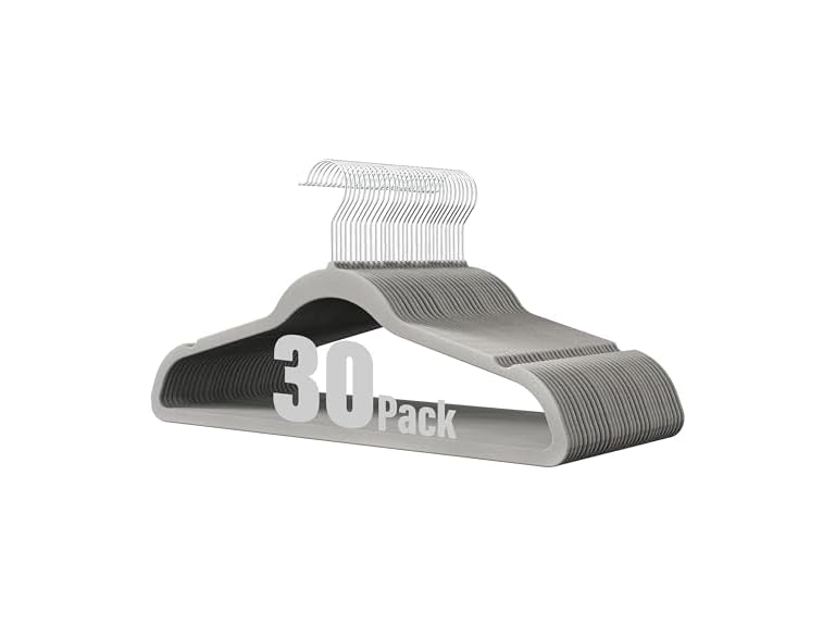 - (1) HealSmart 30 Pack Heavy Duty Velvet Hangers, Non-Slip Flocked Felt Hangers with Shoulder Notches, Hangers for Coats, Pants and Dress Clothes, Grey