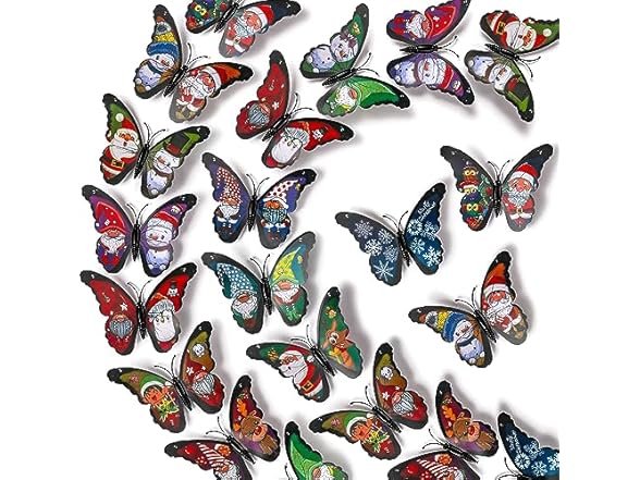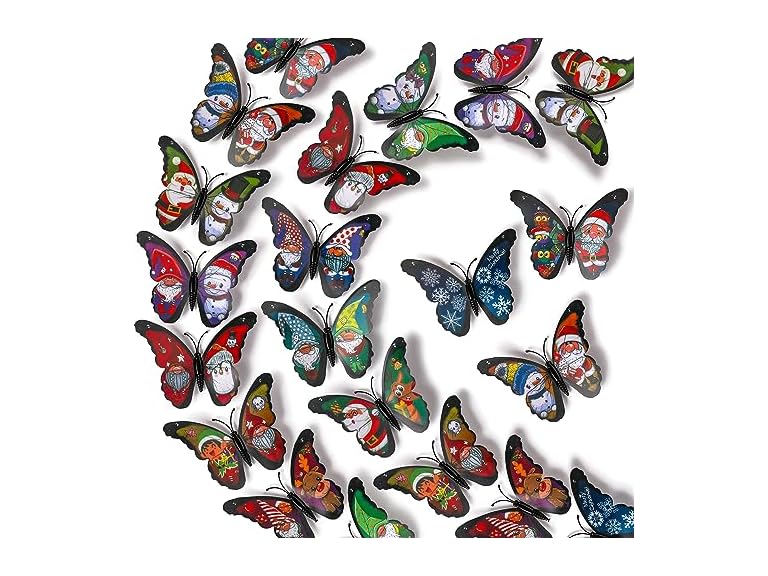 - (1) LiveGallery 72 PCS 6 Colors Removable 3D Merry Christmas DIY Beautiful Butterfly Wall Decals Colorful Santa Claus, snowmen, snowflakes, elk Butterflies Art Decor Wall Stickers Murals for Kids Baby Boy