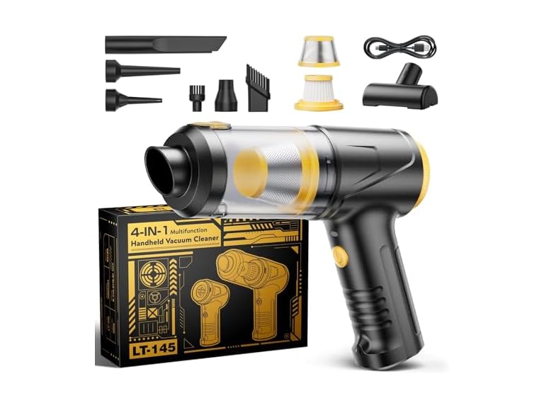 - 4-in-1 Handheld Vacuum (7 Accessories Included) - One device, endless solutions. Blow away debris from keyboards, vents & electronics. Deep-clean car seats & tight gaps. Rapidly inflate air mattresses, pool floats & balloons. Deflate storage bags fast. 7 practical accessories conquer any cleaning challenge anywhere – home, car, or on-the-go