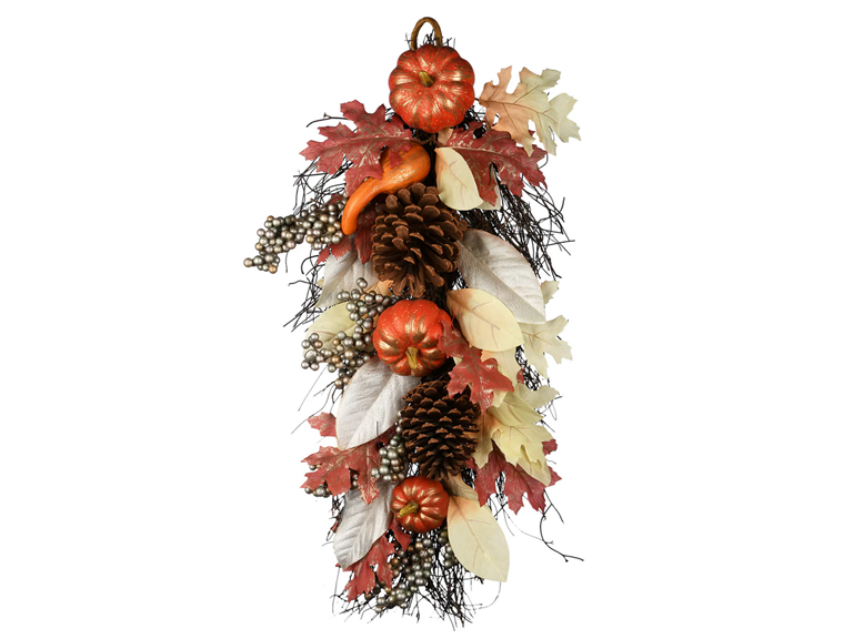 - Designed and decorated to look and feel lifelike, this 24 inch autumnal teardrop decoration is the perfect complement to any fall-themed arrangement.