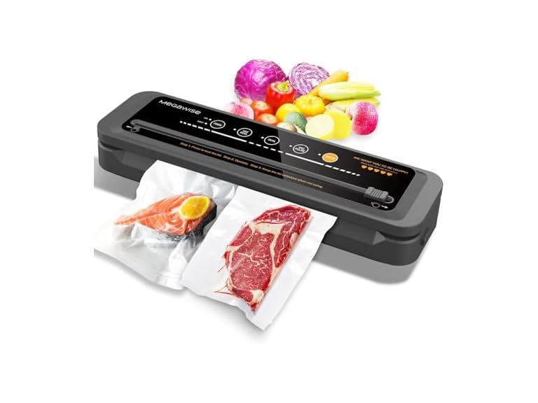 - (1) MegaWise Vacuum Sealer Machine | 80kPa Suction Power| Bags and Cutter Included | Compact One-Touch Automatic Food Sealer with External Vacuum System | Dry Moist Fresh Modes for All Saving needs