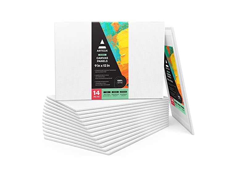 - (1) ARTEZA Canvas Boards for Painting, 9 x 12 Inches, Pack of 14, Blank White Canvas Panels for Acrylic, Oil and Gouache Painting