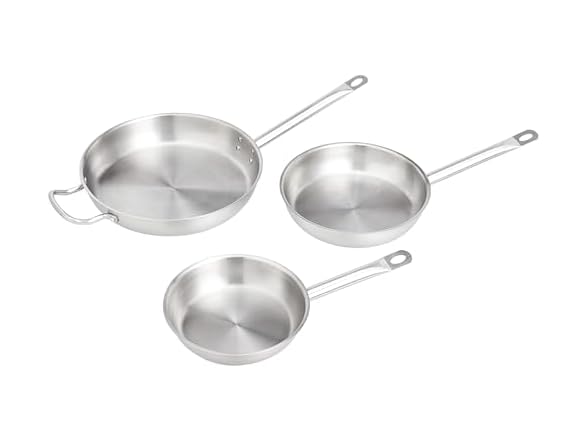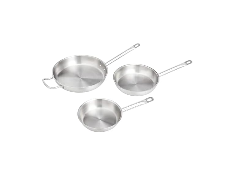 - Amazon Basics 3-Piece Stainless Steel Aluminum-Clad Fry Pan Set, Dishwasher Safe, Induction Compatible, Oven Safe to 500°F, 8", 9 1/2", and 12"