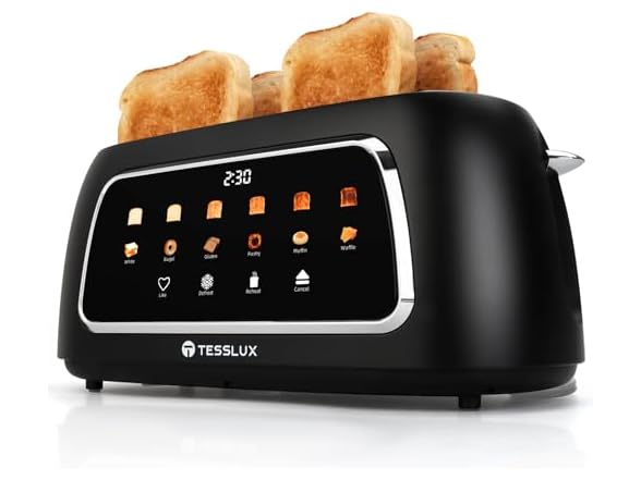 - đăIntuitive Touchscreen DisplayăSimplify your toasting experience with a large touch panel showcasing cooking time. Upgrade your kitchen with the Tesslux touch screen toaster for precise control and modern design.