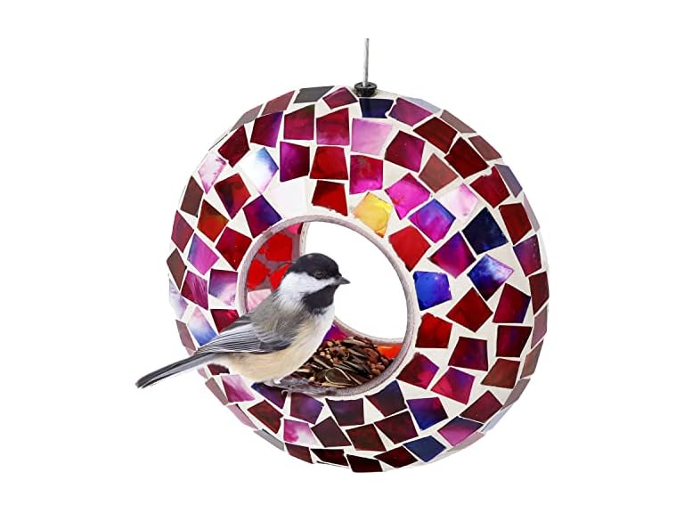 - ATTRACT BIRDS TO THE YARD: This cute bird feeder features vibrant colors and a mosaic glass construction that is sure to appeal to humans and birds alike. The bright colors and reflective material will help attract a variety of bird species to the feeder including cardinals, finches, sparrows, and more. Plus, it will add a stylish pop of color to any patio decor. The open fly-through design also makes it easier for birds to access the seed, encouraging them to come back again and again.