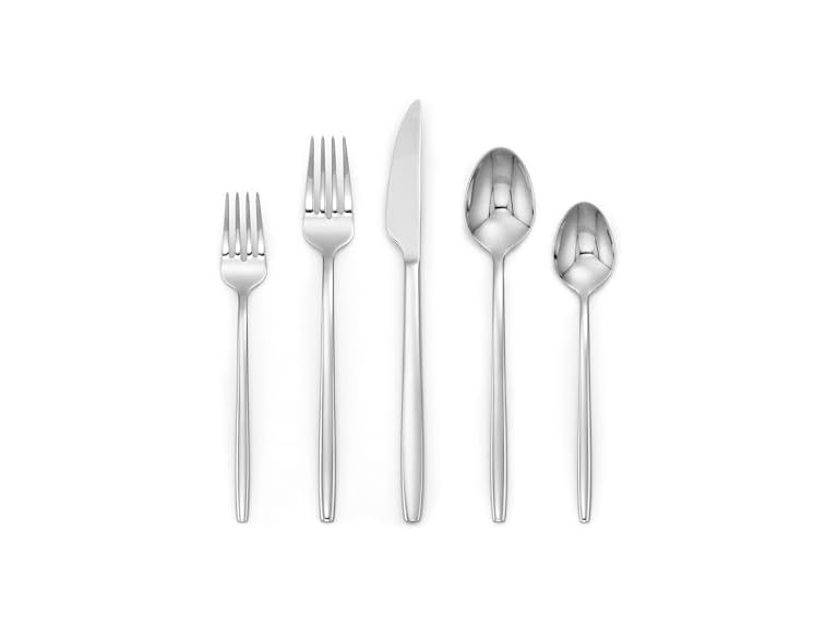 - Place setting includes dinner fork, salad fork, dinner knife, dinner spoon, and teaspoon