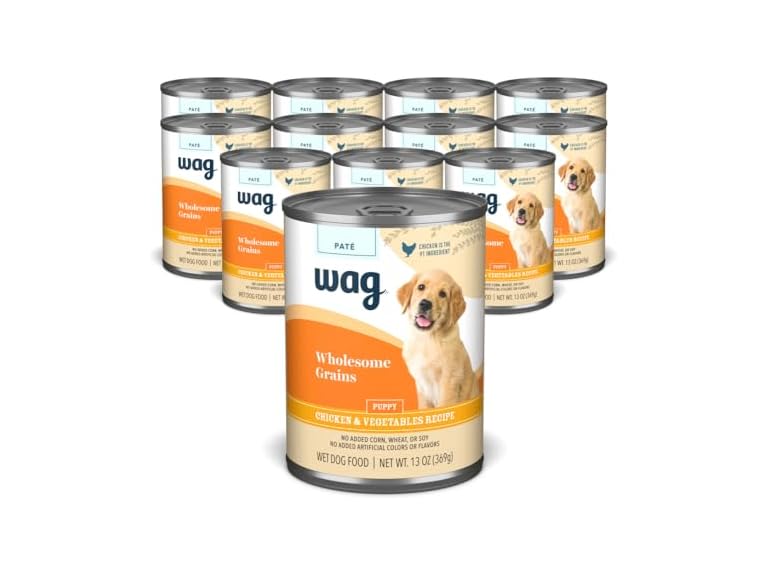 - (1) Amazon Brand - Wag Wholesome Grains Canned Wet Dog Food, Chicken & Vegetables Paté, Puppy Recipe, 13 Ounce (Pack of 12)