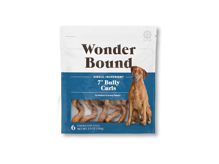 - (1) Amazon Brand - Wonder Bound Bully Curls, All-Natural, Highly Digestible, Long Lasting Dog Beef Treats, 7 inch, 6 Count