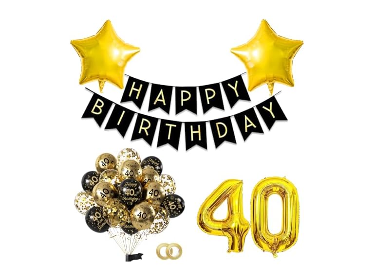 - Men Women 40th Birthday Decorations : You will get a black gold happy birthday banner, gold 32inch 40 foil balloon, 2pcs 18inch star foil balloon, 5 pcs black balloons with birthday printed double sides, 5 pcs gold confetti balloons, 5 pcs metallic gold balloons with birthday printed double sides and ribbons