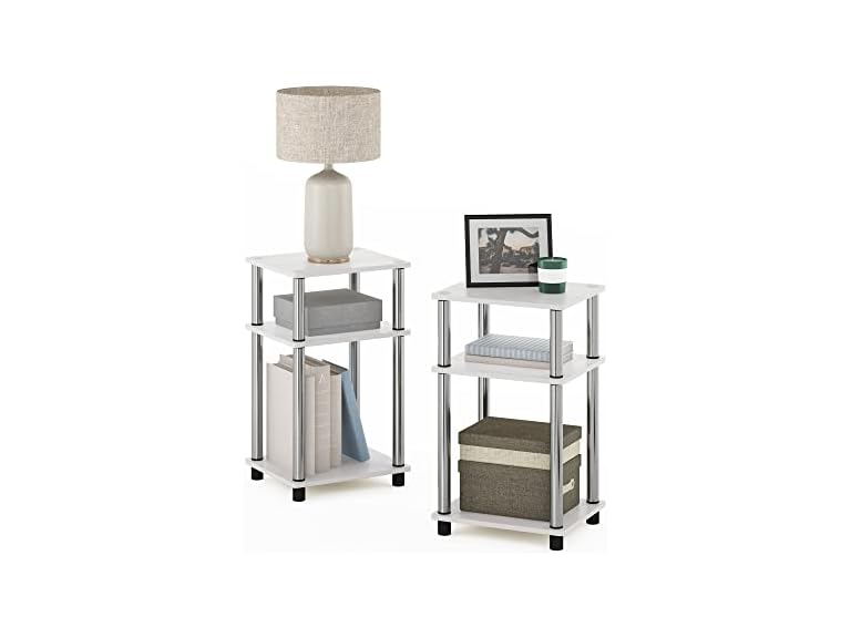 - (1) Furinno JUST Side Table Set of 2, 3-Tier End Tables, Open Shelves Night Stand, Nightstand, Toolless Assembly, for Living Room, Bedroom, White Oak/Stainless Steel