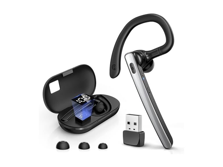 - USB Dongle & Bluetooth 5.3: With Bluetooth 5.3 connection, you can freely move up to 33 feet and connect a second smartphone or desktop using your bluetooth headset's multipoint technology. You can promptly answer calls from another phone through Sp1 while multitasking, ensuring you never miss a call. The bluetooth earpiece for computer comes with a dongle, making it compatible with desktops. If your device lacks Bluetooth functionality, plug the dongle into a USB port, and it will automatically connect to Sp1. Please read the user manual carefully before use.