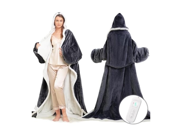 - 【Wearable Warmth】The cozy wearable heated blanket can be worn as a robe, covering you from head to toe with sleeves, hood and foot pockets. Leave the winter cold behind, wrap yourself in the heated blanket, enjoy comfortable time on the couch.